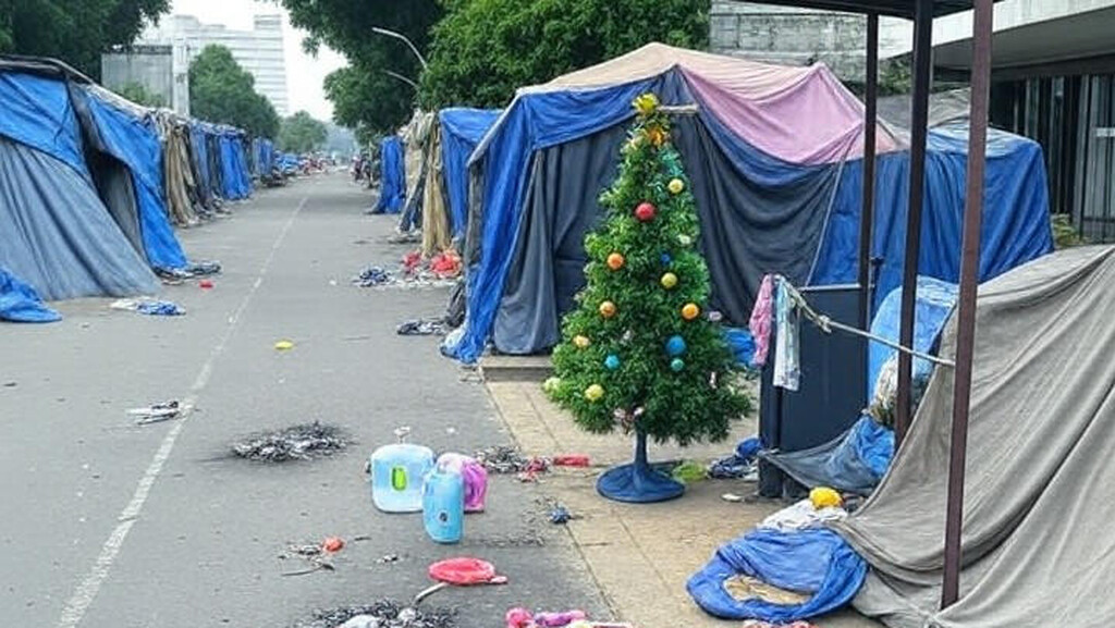 Acampamentos de pessoas em situação de rua têm se espalhado por diversas vias do Distrito Federal neste fim de ano, ocupando calçadas, canteiros e áreas públicas. Registros em regiões administrativas como Asa Norte, Taguatinga e a via N4 revelam a presença de adultos, idosos, crianças e até bebês vivendo em estruturas precárias. Na Asa Norte, em Brasília, famílias inteiras foram observadas, incluindo uma idosa cadeirante e uma criança brincando com um patinete ao redor de uma barraca. Próximo ao local, uma árvore de Natal improvisada e roupas infantis sobre as tendas destacam o contraste entre a festividade e a dura realidade.